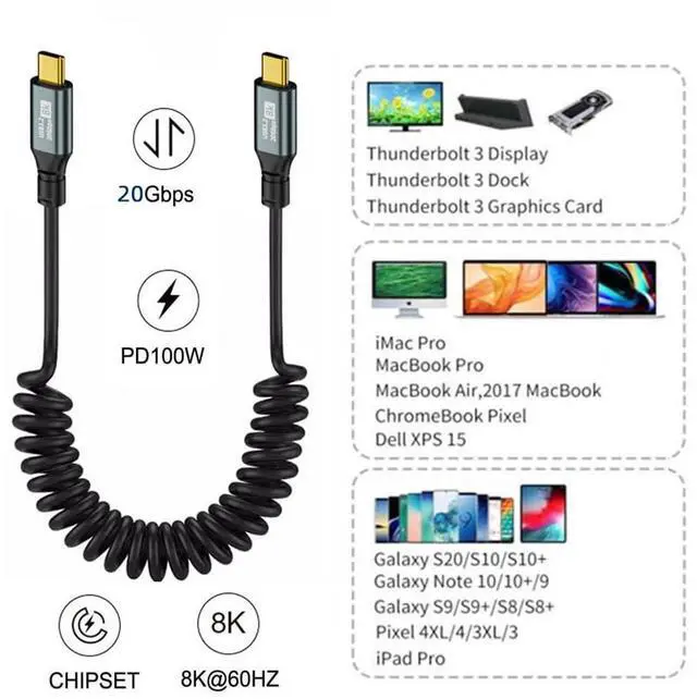 USB4 Cable Stretch Coiled USB-C Type-C Male to Male Charging Data Extension Cord 20Gbps 100W 8K for Laptop Keyboard Tablet