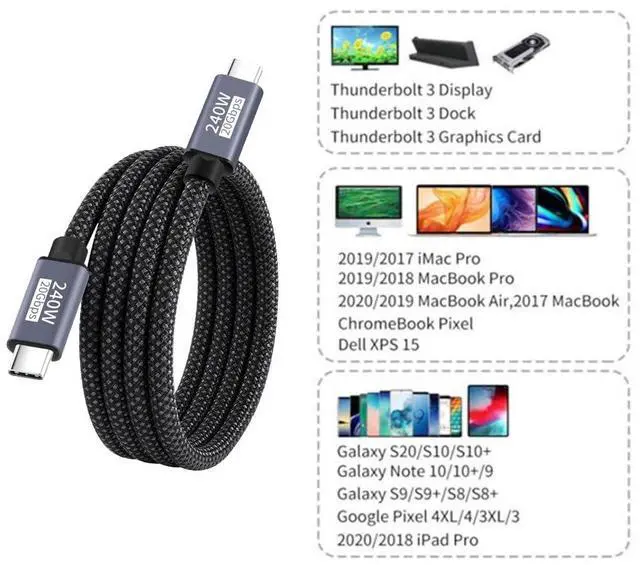 This USB4 Type-C Cable is widely compatible with Most of USB-C Devices (Mainly Laptops), Such as Mac Pro 2020,2019,2018,XPS, Chrome Book and other DP Alternated Mode Supported Devices, backward compatible with Thunderbolt3, You can also connect with Hard Drivers and Docking Stations for Data.