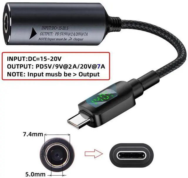 Smart LED Display DC Jack 7.4x5.0mm Input to USB-C Type-C Power 140W Charge Cable for Laptop Phone PD9V 5V 20V7A