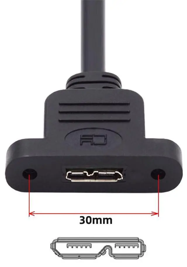 There is 2 screw holes at Micro USB 3.0 Female end. Cable length: approx. 50cm.