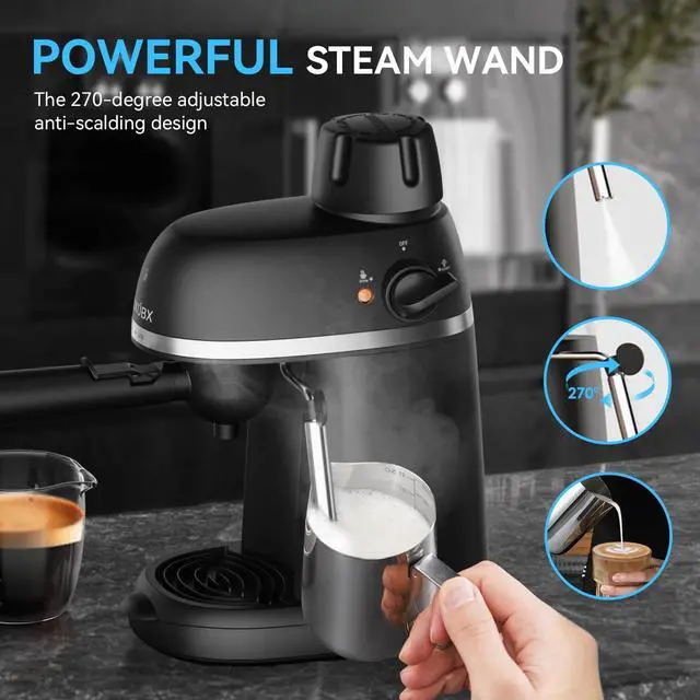 The package includes a stainless steel milk frothing wand for creating smooth foam for cappuccinos, lattes, or macchiatos. The adjustable steam nozzle lets you control froth texture, while the compact design keeps all tools neatly integrated.
