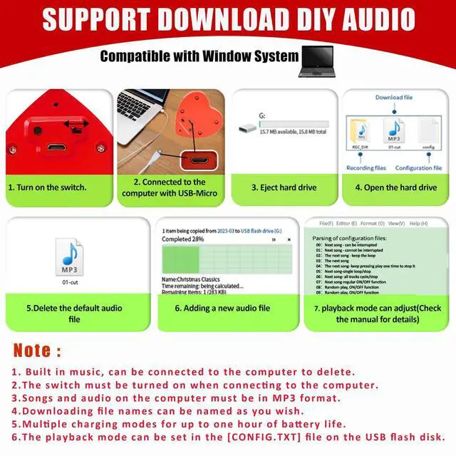 | Specifications | Size: XIN7004-Only Download, Brand: XLW, Color: Red, Style: XIN7004-Only Download, Format_0: gift_box, Format_1: audiobook, Format_2: mp3_audio, Format_3: greeting_card, Battery_weight: 6 grams, Battery_average_life: 50 minutes, Battery_cell_composition: lithium_ion, Display_size: 3.38 inches, Skip_offer: false, Item_weight: 28 grams, Part_number: XIN7004-DXZ-240123-CH, Unspsc_code: 52161535, Manufacturer: XLW, Model_number: XIN7004-DXZ-240123-CH, Num_batteries_type: lithium_ion, Num_batteries_quantity: 1, Headphones_jack: #, Item_dimensions: 2.36 L x 2.36 W x 0.71 H inches, Lithium_battery_packaging: batteries_contained_in_equipment, Lithium_battery_energy_content: 110 milliampere_hour, Number_of_items: 1, Batteries_included: true, Batteries_required: true, Compatible_devices: MP3 Player, Hardware_interface: usb, Included_components: voice recorder, Item_package_weight: 0.041 kilograms, Warranty_description: 1, Microphone_form_factor: Built-In, Item_depth_width_height_depth: 2.36 inches, Item_depth_width_height_width: 2.36 inches, Item_depth_width_height_height: 0.71 inches, Item_package_dimensions: 2.1082 L x 8.1026 W x 12.4968 H centimeters, Memory_storage_capacity: 16 MB, Product_site_launch_date: 2024-02-29T08:00:00Z, Microphone_operation_mode: Mono, Number_of_lithium_ion_cells: 1, Includes_rechargable_battery: true, Number_of_lithium_metal_cells: 1, Supplier_declared_dg_hz_regulation: not_applicable, Supplier_declared_has_product_identifier_exemption: true |