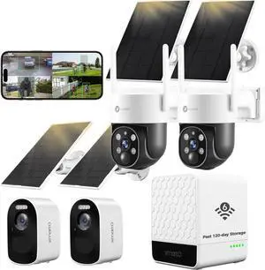 xmartO 2K QHD Wireless Solar Security Camera System for Homes, 2 Fixed Cameras & 2 PTZ Surveillance Cameras with WiFi 6 Base (Long Range WiFi, 4-CAM View, Past 120-day Storage, 0 Monthly Fee)