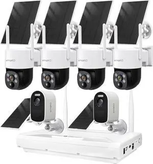 xmartO 100% Wire-Free PTZ Solar Home Security Camera System Wireless, 6-Set 2K 4MP QHD CCTV Camera Kit with 4k 10CH Expandable WiFi NVR Screen, All-Weather Solar Charge