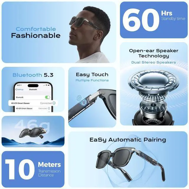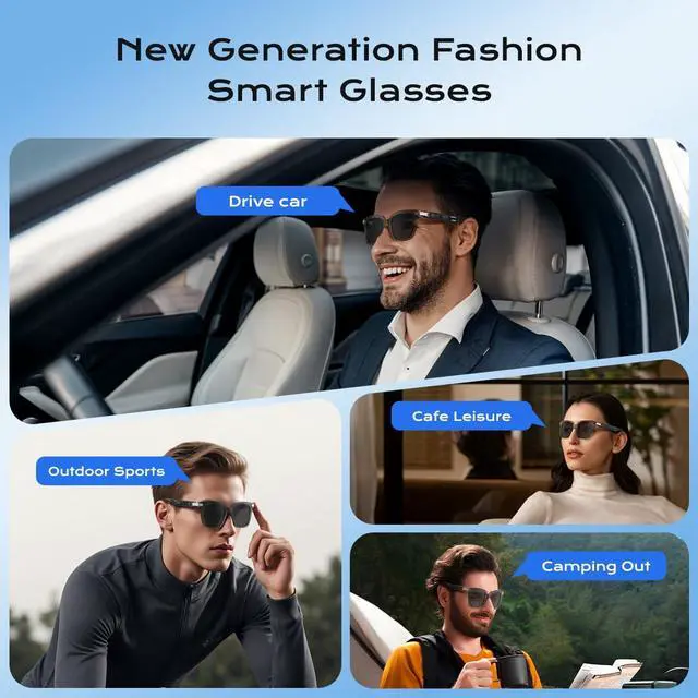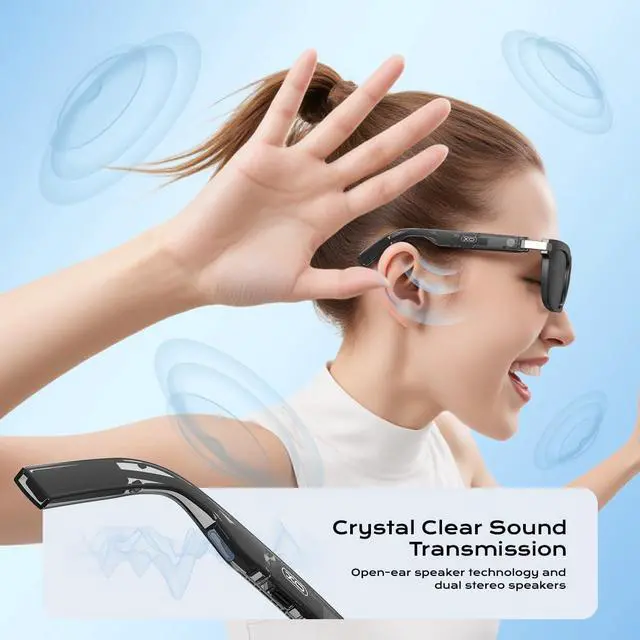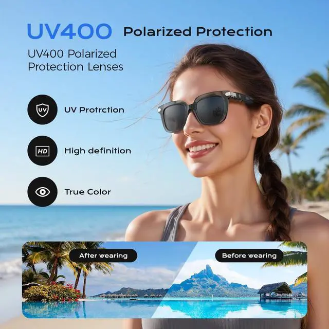 UV400 Polarized Protection Lenses& Crystal-Clear AudioPolarized Bluetooth sunglasses apply UV400 full-protection lenses that protect your eyes while offer outstanding color, clarity, and contrast.With a stylish appearance design, it is suitable for various occasions. Moreover, With open-ear speaker technology and dual stereo speakers, these smart glasses deliver clear sound directly to your ears for calls, music, podcasts, audio books, and navigation.