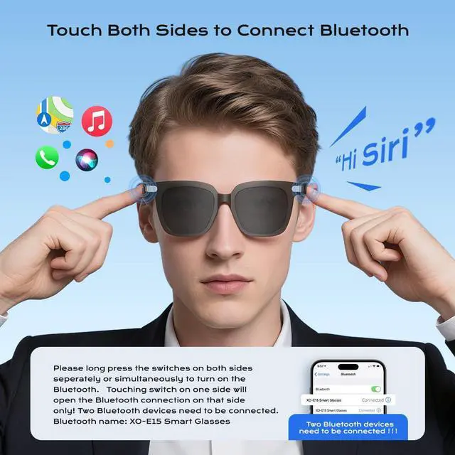 Warm Tips:Please long press the switches on both sides seperately or simultaneously to turn on the Bluetooth. Touching switch on one side will open the Bluetooth connection on that side only! Two Bluetooth devices need to be connected. Bluetooth name: XO-E15 Smart Glasses
