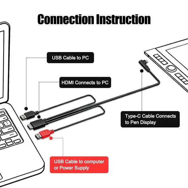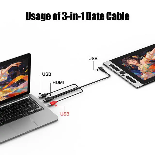 3-in-1 cable with HDMI, type C, USB A cable;Connect your pen display to your computer, so that the creative content of the pen display is synchronized with the computer