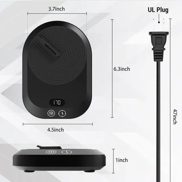 2-12H Timed Auto Shutdown Mug Warmer -- The coffee mug warmer with auto shutdown timer will automatically shut down after 4 hours of continuous operation by default. We set up six options of 2-12h according to different use conditions of users. You can set the automatic shutdown time according to your own needs. More convenient and effectively prevent the safety hazards caused by forgetting to close with the coffee warmer.