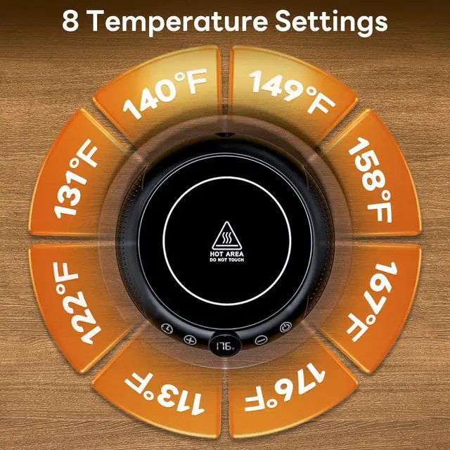 8 Temperature SettingsCoffee or tea lovers never want their steamy drink to get cold before they sip it because it kills the excitement. Our coffee cup warmer have 8 temperature options 113, 122, 131, 140, 149, 158, 167and 176, so you can have warm coffee or tea to your desired temperature.