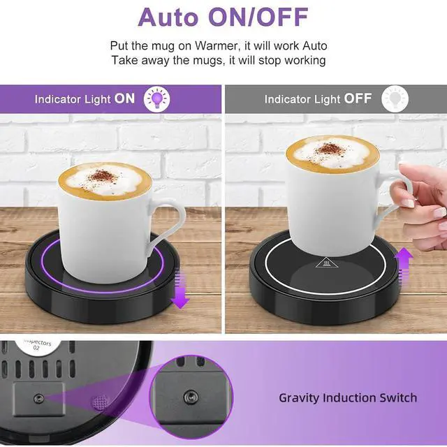 - Built-In Gravity Induction Switch - Just place your mug on it, it will automatically turn on, no need to turn it on/off manually. Easy to use! Exceeds expectations in every way.