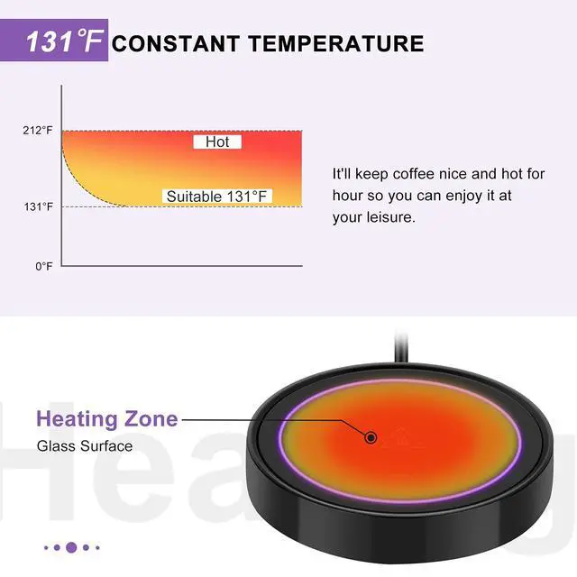 - Adopt Water-resistant Design - The heating area of heated coffee mug was covered with a layer of thermal conductive glass without the need for security concern for the occasional spill and it is easy to clean.