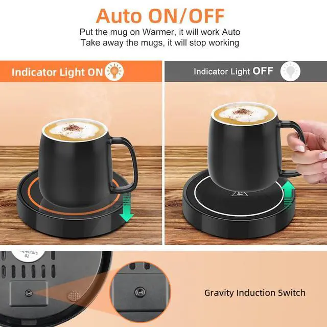 - Built-In Gravity Induction Switch - Just place your mug on it, it will automatically turn on, no need to turn it on/off manually. Easy to use! Exceeds expectations in every way.