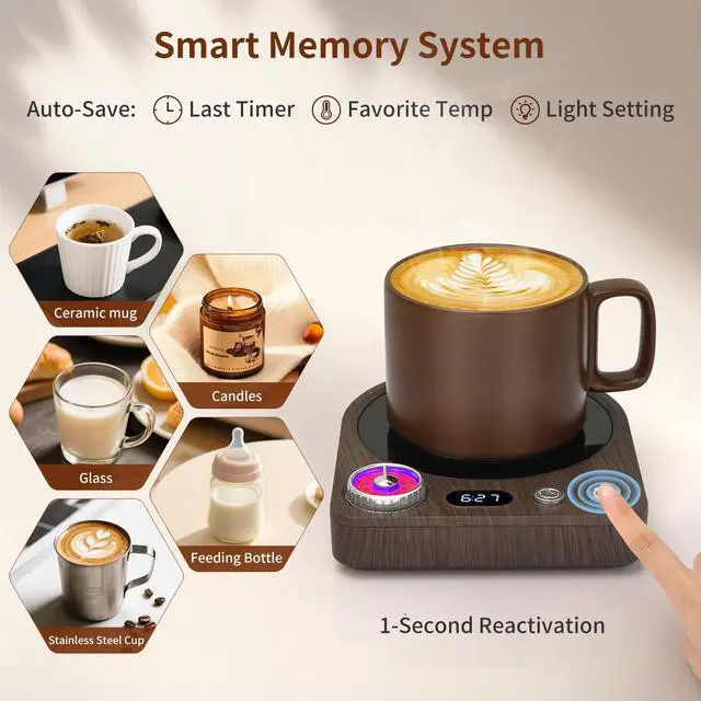 One tap starts your coffee warmer. Smart memory recalls your last timer, preferred temp, and light setting—skip setup, perfect for the senior, enjoy effortless warmth.