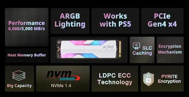 | Features | Unleash elite gaming performance with this high-end RGB Gen4 SSD, featuring iconic “X” design language for true gaming spirit. Delivering blazing-fast 6,000/5,000MB/s speeds. Compatible with PS5 expansion and the latest Intel/AMD platforms, it’s your ultimate upgrade. ? High-performance RGB Gen4 SSD ? X signature design, built for hardcore gaming ? PCIe Gen4 x4 transmission interface ? R/W speed up to 6,000/5,000MB/s for PC/laptop ? Work with PS5 as expanded storage ? SLC Caching and Host Memory Buffer ? Supports latest Intel and AMD platforms ? Pyrite encryption support ? Advanced LDPC ECC Technology |