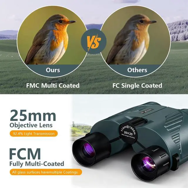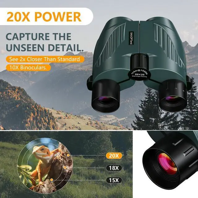 It offers 20X power (double 10X), ensuring objects are significantly closer. Features Professional BAK4 Prisms for ultimate clarity and sharpness. Max light transmission delivers bright, detailed views, even in low light.