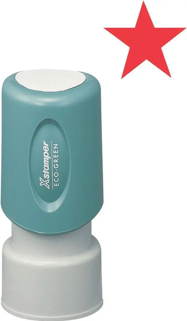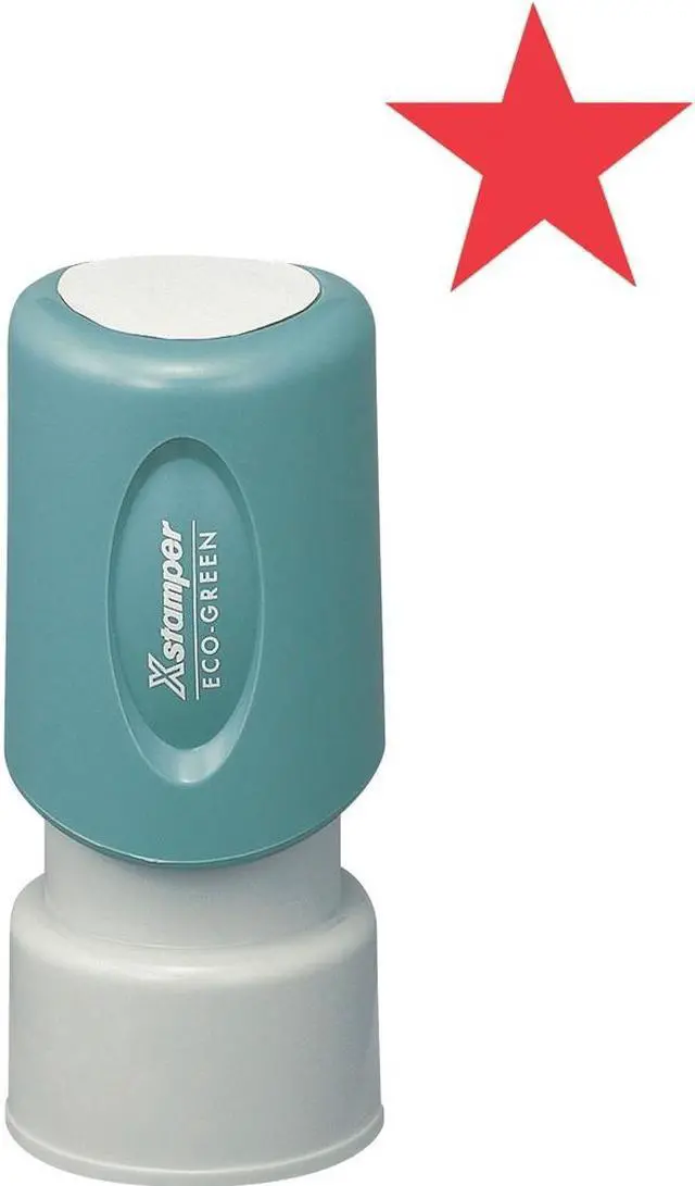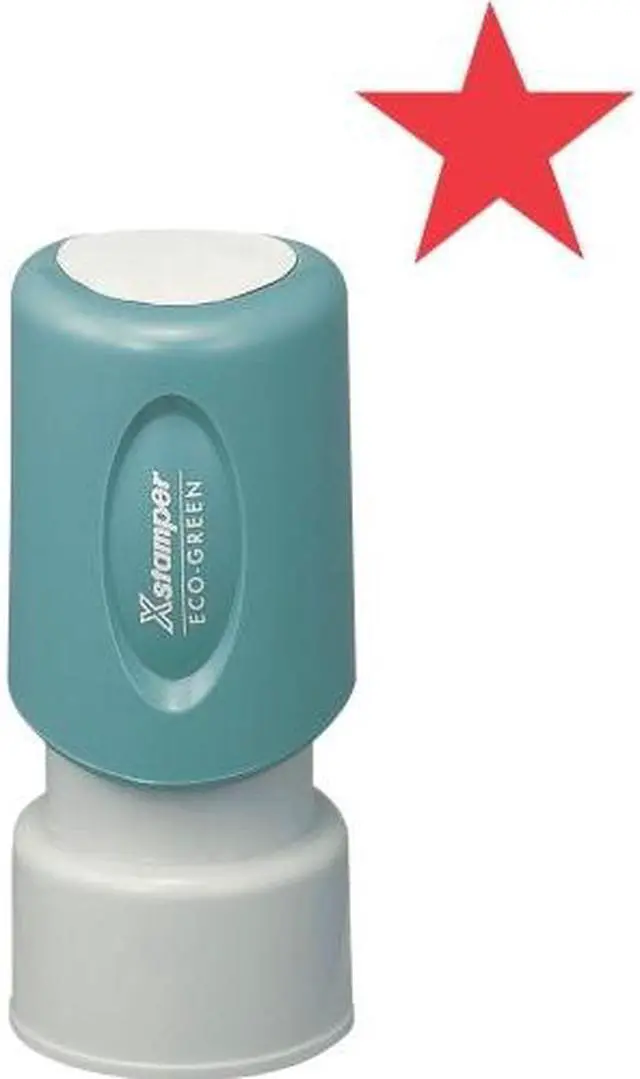 Xstamper Pre-Inked Star Shape Stamp - Design Stamp - "STAR" - 0.63" Impression Diameter - Red - Plastic Cap - Recycled - 1 Each Red ink stamp with a star shape is pre-inked and re-inkable. Retractable frame keeps stamp surface away from desktop until ready to use. Plastic cap makes it safe to carry in purse or pocket. Impression size is 5/8" diameter.