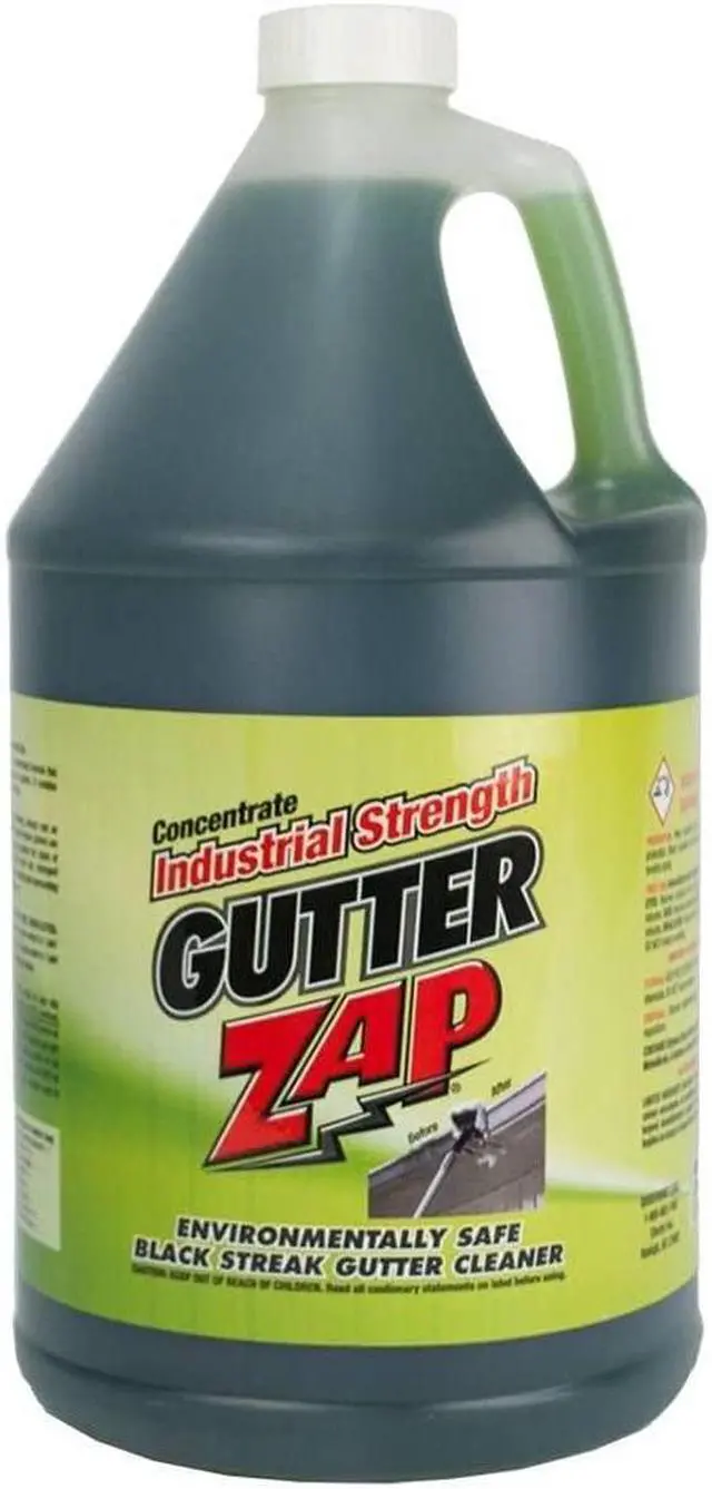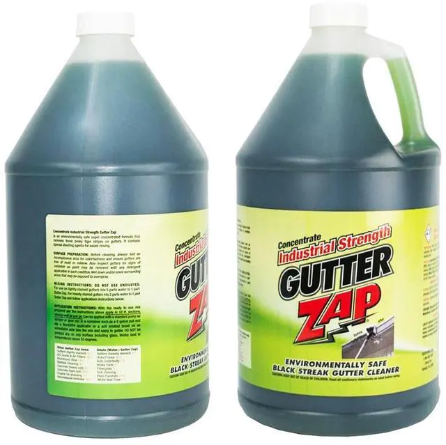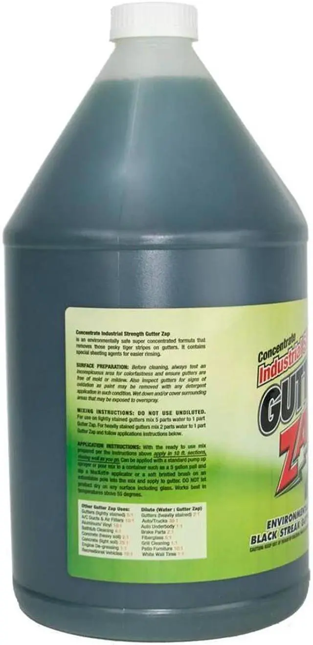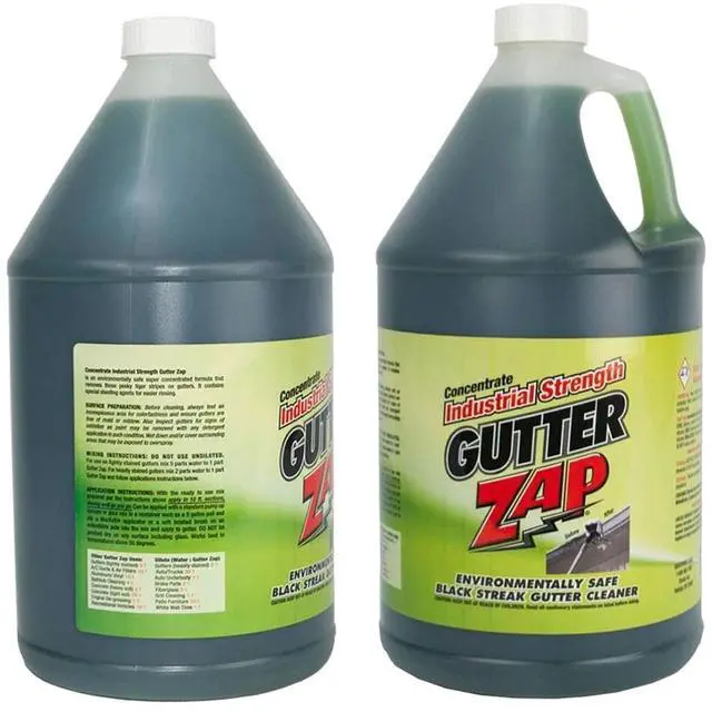 Xterior Inc The specialized Gutter Zap concentrate is a revolutionary cleaner developed to remove those unsightly black streaks on gutters caused by the electrostatic bonding of dirt grime and acid rain runoff from roofs. Upsell your gutter cleaning services from clearing debris to shining up the outside of gutters for greater curb appeal on your clients homes. Clean touchless by spraying on and rinsing off or use light agitation with a soft brush for tougher stains. Apply with the marxoff applicator for the best result. Special sheeting agents allow for easier rinsing. Depending on the strength dilute half and half or one part product to three parts water.