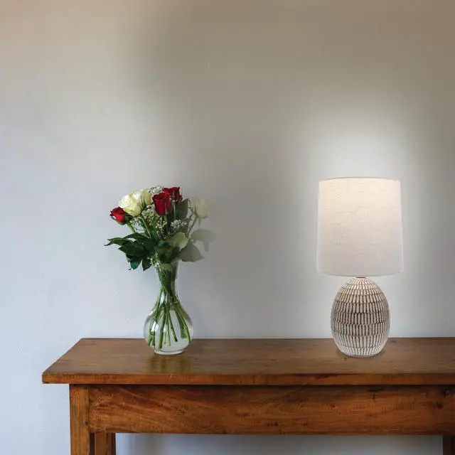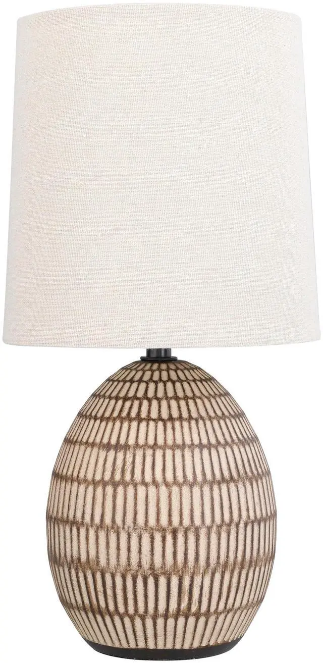 The Xtreme Ceramic Table Lamp combines elegance and functionality in a compact design. Standing 12.75 inches tall, this lamp features a beautifully carved textured ceramic base that adds a touch of sophistication to any room. The intricate detailing of the base enhances its modern aesthetic, making it a stylish choice for a variety of interior decor styles. The lamp is topped with a chic beige shade that diffuses light gently, creating a warm and inviting glow. The neutral color of the shade complements the brown base, making it a versatile addition to spaces such as bedrooms, living rooms, or any area that requires both style and illumination. Its compact size is perfect for bedside tables, nightstands, or smaller surfaces, providing ample light without overwhelming the space. Designed to accommodate a standard E26 bulb, the lamp offers flexibility in lighting options. You can choose a bulb that provides the exact level of brightness needed, from a soft, warm light for relaxation to a brighter option for reading or other tasks. This lamps understated elegance and functional design make it an ideal decor addition. Whether used as a bedside lamp in a bedroom, an accent piece in a living room, or a stylish light source in a home office, it enhances both the functionality and aesthetics of your space.