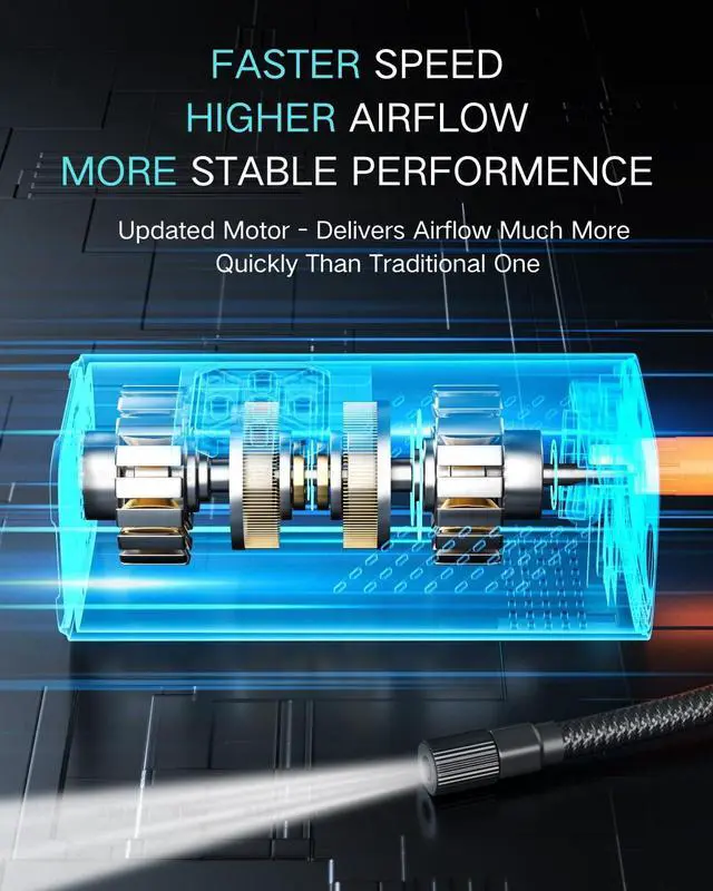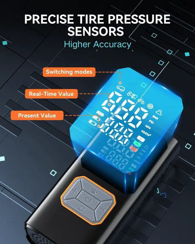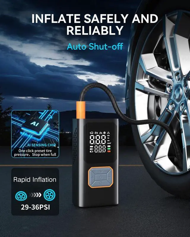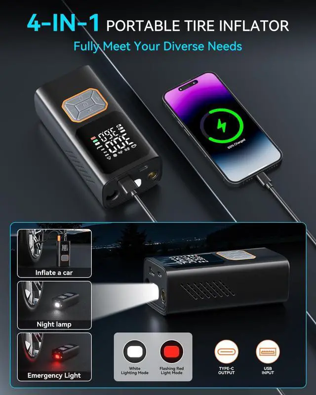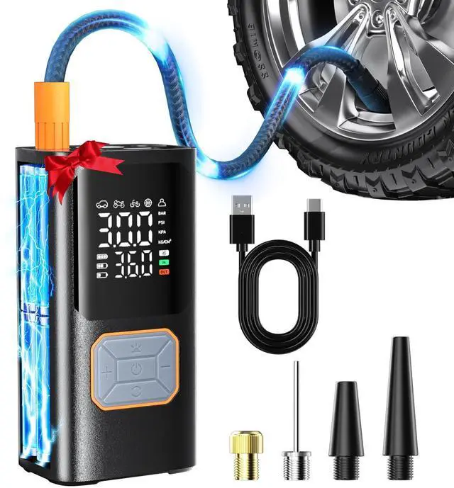 Portable air pump for car tiresthis compact and cordless air compressor delivers powerful inflation at 150psi, working faster than traditional pumps. featuring a digital dual values display and built-in led lights, it ensures accurate pressure readings even in low-light conditions. the integrated pressure gauge allows precise inflation for car tires, bicycle tires, and electric bike tires. its auto shut-off function prevents over-inflation, making it a safe and reliable choice. portable and mini in size, this handheld tire inflator is perfect for on-the-go use. ideal as a car air pump, bike tire pump, or portable air compressor for car tires, it's a versatile tool for all your inflation needs. whether you need a tire pump for car portable use or a bicycle air pump, this cordless tire inflator is your go-to solution. compatible with various tires, it serves as an efficient electric air pump, air inflator, or portable bike pump. lightweight yet powerful, it's the best mini air compressor for quick and easy inflation anytime, anywhere.