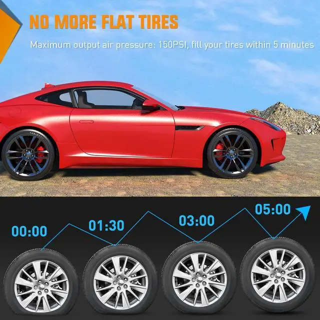 Nilight Tire Pump can inflate the 195/55/R15 car tires from 0 to 35psi within 5 minutes. Professionally inflate your flat tires much more effectively and faster than traditional tire pumps. Suitable for inflating tires on cars, MPVs, bikes, sedans, midsize SUVs, etc.