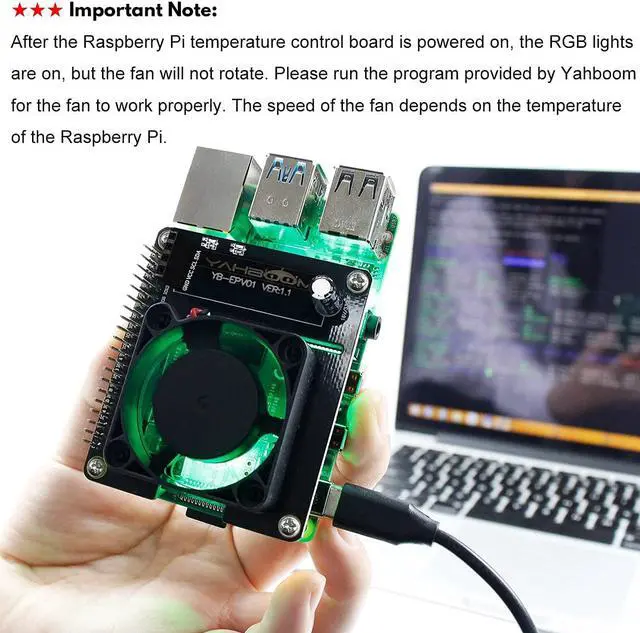 The Raspberry Pi cooling hat driver package is already installed and is suitable for all Raspberry Pi system images, while Yahboom offers all the necessary courses.Important Note: Only the RGB lights will be on after the Raspberry Pi hat is powered on. You must run the program provided by Yaboom before the fan will rotate according to the temperature of the Raspberry Pi board. If you do not run the program, your fan will not rotate!