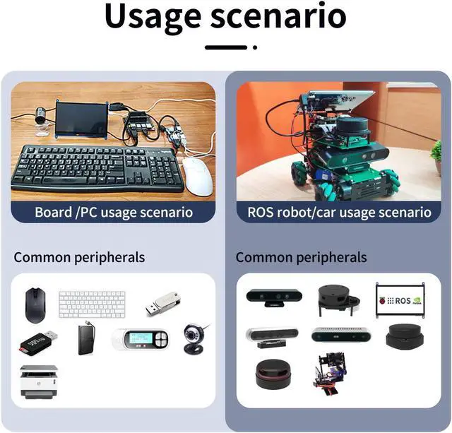 Support equipment -- Support ROS robot / car, Raspberry Pi / Jetson series board, PC, other boards, industrial computer, etc. Compatible with win7 / 8 / 10, Linux, Ubuntu, MacOS systems, no need drive file, plug and play. If the USB device needs to be restarted, the device can be powered off and restarted through the switching power supply without plugging and damaging the interface.