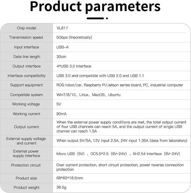 Support wide voltage external power supply -- In addition to the USB-A standard data interface power supply, this product also supports 5V (micro-USB), 9~24V (DC interface/XH2.54 socket) wide-voltage external power supply. Even if multiple high-power peripherals are connected at the same time, the stability of power supply and signal transmission can be guaranteed.