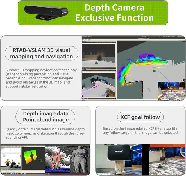 RTAB-VSLAM 3D Visual Mapping NavigationAstra Pro 3D Camera provided by version III supports 3D mapping navigation technology (rtab) containing pure vision and visual radar fusion. Transbot robot can navigate,avoid obstacles and global relocation in the 3D map, and quickly obtain image data such as camera depth map, color map, and skeleton through the corresponding API., based on the image related KCF filter algorithm, any follow target in the image can be selected. Beginning of the 3D world