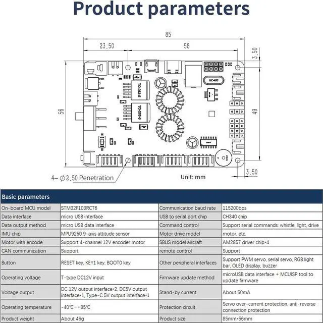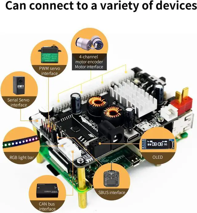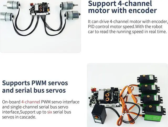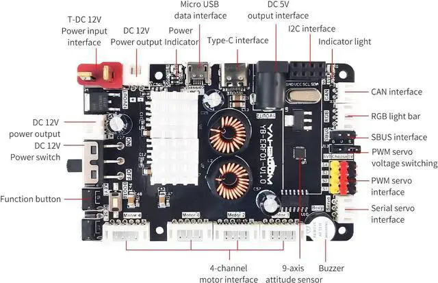 Rich peripheral interfaces: The expansion board supports 4-way encoder motors, which can drive various vehicle types, such as mecanum wheels, four-wheel differentials, tracks, etc.; it also supports PWM servos and serial bus servos, which can adapt to various forms of robot arm development; it also supports USB serial communication, CAN bus communication, and SBUS bus communication.