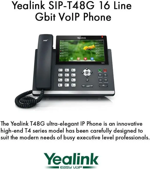 Yealink SIP-T48G. Brand New Includes One Year Warranty.. Item # SIP-T48G The Yealink SIP-T48G is a 16-line ultra-elegant gigabit IP phone that features intuitive user interface and enhanced functionality. It has a phone directory, HD Voice, 7" 800 x 480 color touch screen with backlight and supports PoE. This phone features dual-port 10/100 ethernet switch with integrated PoE that are ideal for extended network use... The phone supports 16 VoIP account, simple, flexible and secure installation options, plus support for IPv6, open VPN and a redundancy server.