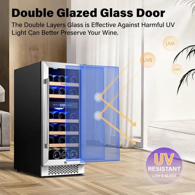 The Yeego wine cooler features a meticulously designed double-layer crystal-clear glass door that not only showcases your wine collection but also provides comprehensive protection for every bottle. Equipped with a UV-resistant coating, the glass door effectively blocks harmful rays, preventing oxidation caused by excessive light exposure and ensuring the wine's quality remains intact. The modern and sleek design of the glass door adds a touch of sophistication to any space--whether it's your living room, dining area, or wine cellar. With Yeego, you get the perfect blend of visual elegance and top-tier functionality. Let your collection shine as a symbol of taste and artistry, while ensuring every bottle is preserved to perfection!