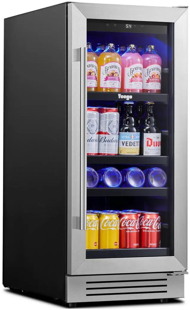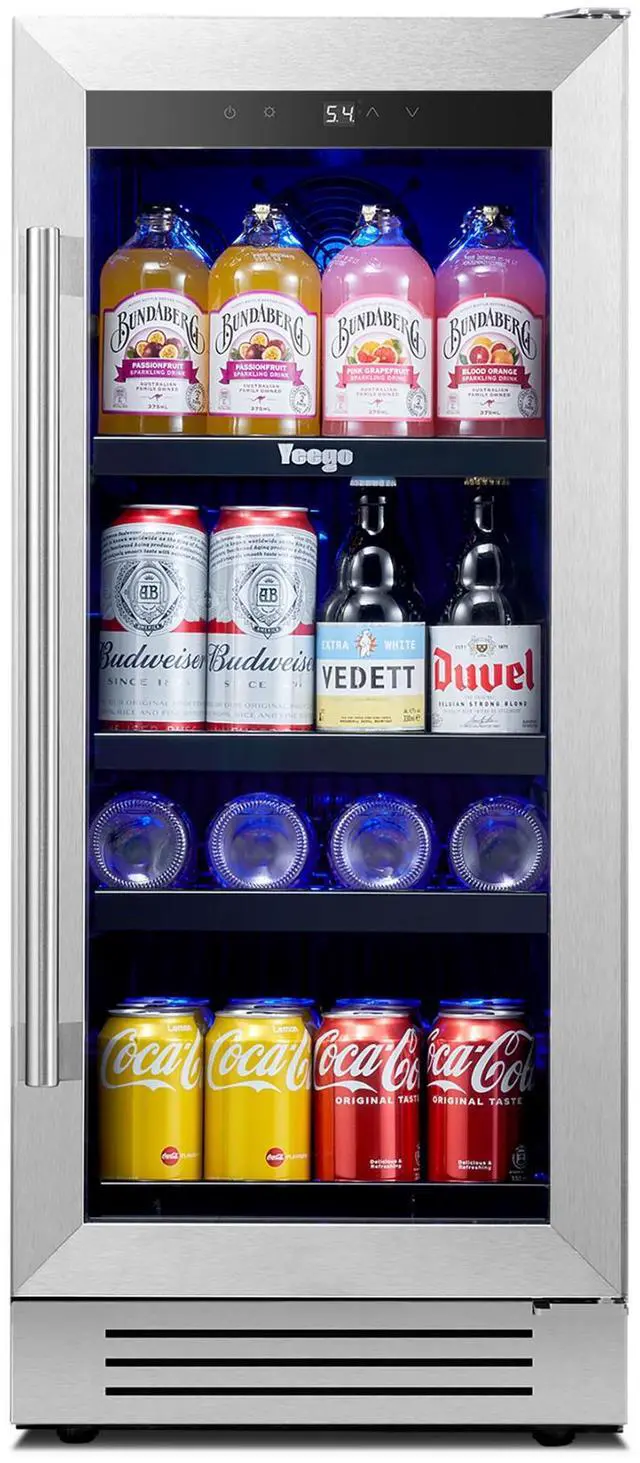 Quiet & Low Vibration Yeego's built-in beverage refrigerator runs quiet operation (38 db), with no disturbance to its natural occurring sediments.Sleek stainless steel frame with 2 layers of tempered glass stabilize temperature levels inside and keep glass from fogging.