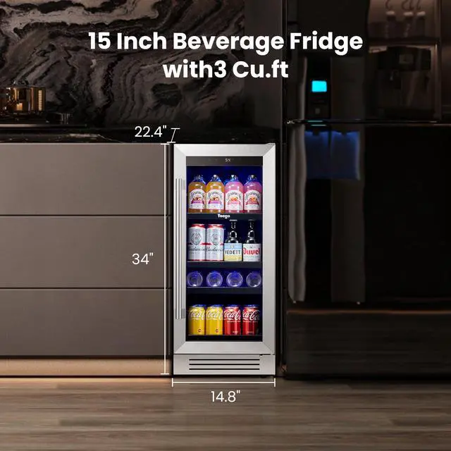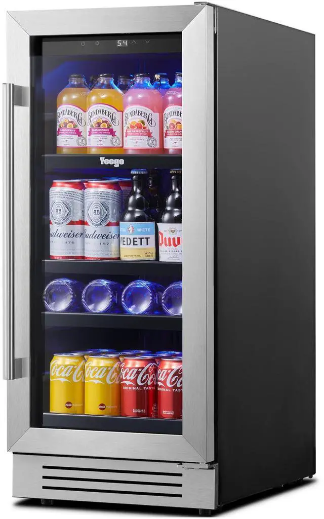 Small Space, Flexibility Capacity Yeego's beverage cooler takes only 14.7(l) x 22.4(w) x 33.9 (h)inches of space and can be installed under counter in the kitchen or bar area, or used as a freestanding in the bedroom or living room! 4 removable shelves, you can set up the space as you like to store different sizes of bottles and cans.