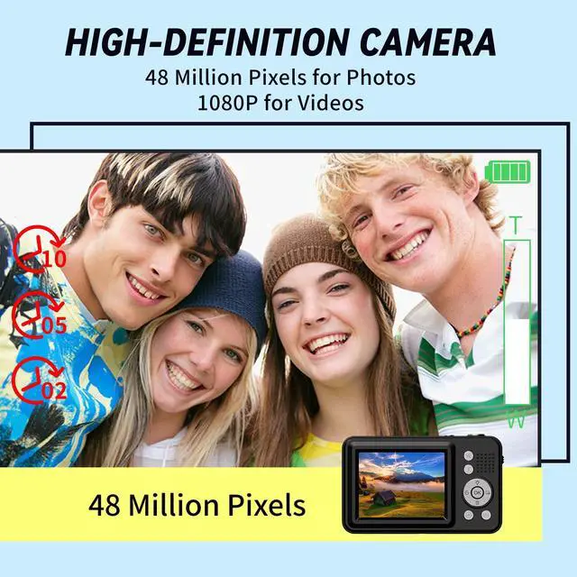 Product Description of Kids Digital Camera This kids digital camera is not only a digital camera designed specifically for kids, but also a practical camera digital. It can meet kids' needs for shooting videos and photos, and even serves as the "first real camera" for many children. As a compact camera, it has a small size and falls into the category of small digital camera. The feature of being a portable camera makes it particularly suitable for travel and outdoor shooting, so kids can carry it easily when going out without any hassle. This digital camera not only comes with a 16X zoom function to capture distant scenes and create more diverse works, but also supports practical features like smile capture, autofocus, continuous shooting, flash, and self-timerfully satisfying kids' needs for image creation. Meanwhile, as a kids digital camera, it can effectively cultivate kids' artistic talents; the basic attributes of camera digital also make it easy to operate, allowing kids to master it quickly. In terms of usage scenarios, this compact camera and portable camera is a perfect gift for girls, boys, and teenagers on important occasions like birthdays and Christmas, and it is definitely a standout option among Christmas gifts for teens. The lightweight design of the small digital camera combined with the practical performance of the digital camera enables it to handle various needs effortlesslywhether it's kids recording daily life or capturing beautiful moments during outdoor activities. Moreover, the precise positioning of kids digital camera makes it an ideal choice for parents when selecting a camera for their kids, and it is also a thoughtful pick for grandparents searching for Christmas gifts for grandkids. It not only meets kids' usage needs but also stimulates kids' creativity through shooting. Whats more, as one of the most practical Christmas gifts for teens and heartwarming Christmas gifts for grandkids, it can bring lasting joy to children during the holiday season and become a precious keepsake of their childhood memories.