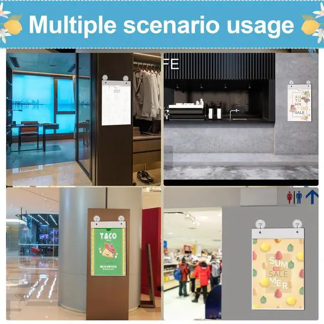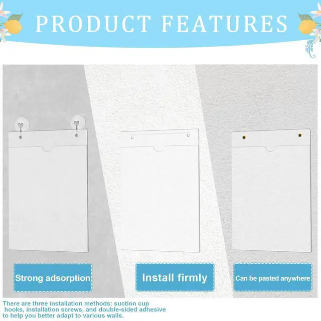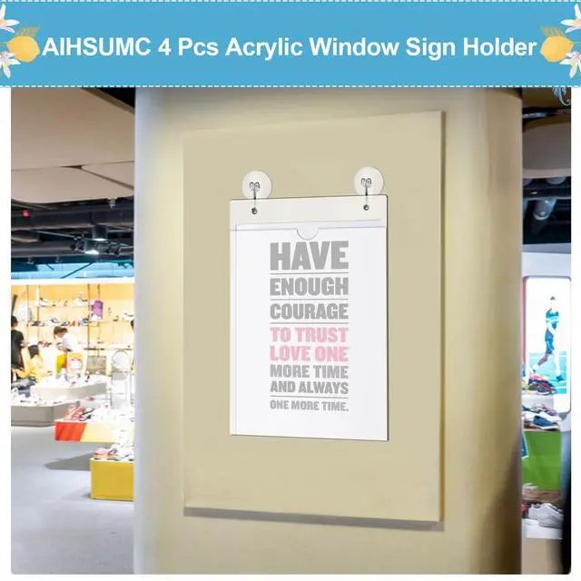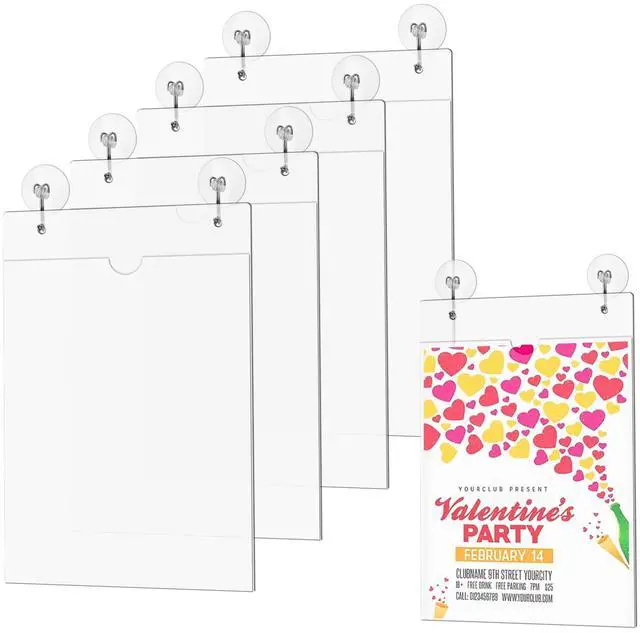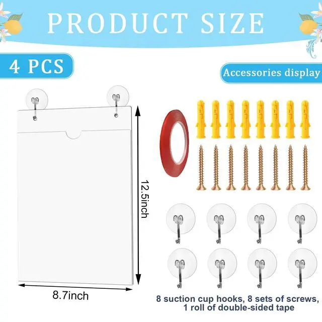 4-pack of acrylic sign holders comes with 8 screws, 8 suction cup hooks and 1 roll of double-sided tape. You can hang the document holder either way, allowing you to hang papers or brochures faster than a regular sign frame.