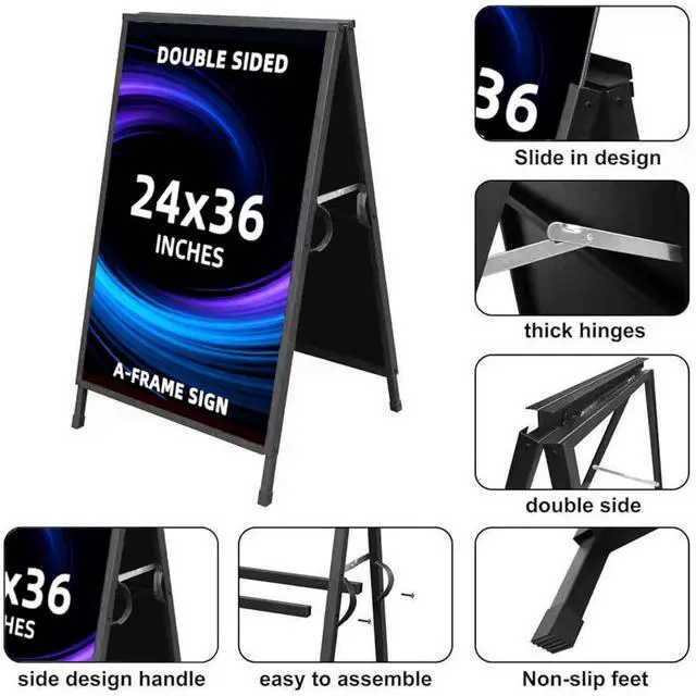 A Frame Sidewalk Sign Holder for Sandwich Boards Maximize the visibility of your advertisements with our premium A Frame Sidewalk Sign Holder, designed for easy display of sandwich boards. Whether you're a restaurant owner, event coordinator, or business proprietor, this versatile sign holder is your key to attracting attention. Key Features: 1. Versatile Sandwich Board Display: Effortlessly showcase your sandwich boards with our push-in design, allowing for easy placement from top to bottom or bottom to top. Enhance the visibility of your promotions, menus, or event details. 2. Optimal Size Compatibility: Designed for 24 x 36 inches boards and posters up to 8mm thick, our A-Frame sandwich board sidewalk sign ensures that your advertising messages stand out. Display two sandwich boards simultaneously to capture attention from all angles. 3. Sturdy All-Metal Construction: Coated with classic black paint, our sign holder features high-quality painted iron, providing a robust and durable frame. Dustproof and weatherproof, it withstands the elements for long-lasting outdoor and indoor use. 4. Portable and Convenient: The foldable design makes transportation a breeze, fitting easily into your car. Change sandwich board content effortlessly without disrupting the ground structure, making it ideal for dynamic advertising needs. 5. Wide Range of Applications: Perfect for various settings, including pedestrian streets, restaurants, bars, museums, and indoor displays. Its solid construction ensures stability, eliminating concerns about accidental tipping. 6. Complete Package for Hassle-Free Setup: Receive 1 Double-Sided A Frame Sign, 12 screws, 1 L shape wrench, and a user manual. Everything you need for a smooth setup and effective sandwich board advertising experience. Invest in our A Frame Sidewalk Sign Holder to elevate your advertising game and ensure your messages are seen by a broader audience. Order now for a durable, versatile, and convenient solution to showcase your sandwich board content.