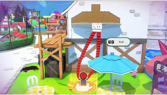 Out of battle, Mario can use the arm-extending 1, 000 Fold Arms ability in specific spots to interact with the landscape to pull, peel, hit and more.