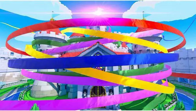 With five giant streamers under his control, King Olly binds Princess Peach's castle and transports it to a distant mountain as part of his plan to refold the world.