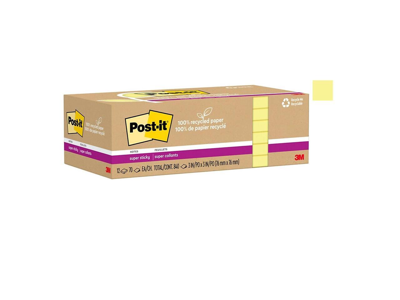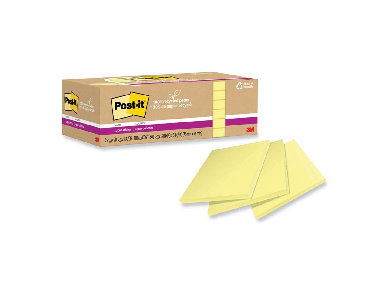 Post-it Recycled Super Sticky Notes 3" x 3" Canary Collection 70 Sheet/Pad 12 Pads/Pack (654R-12SSCY)