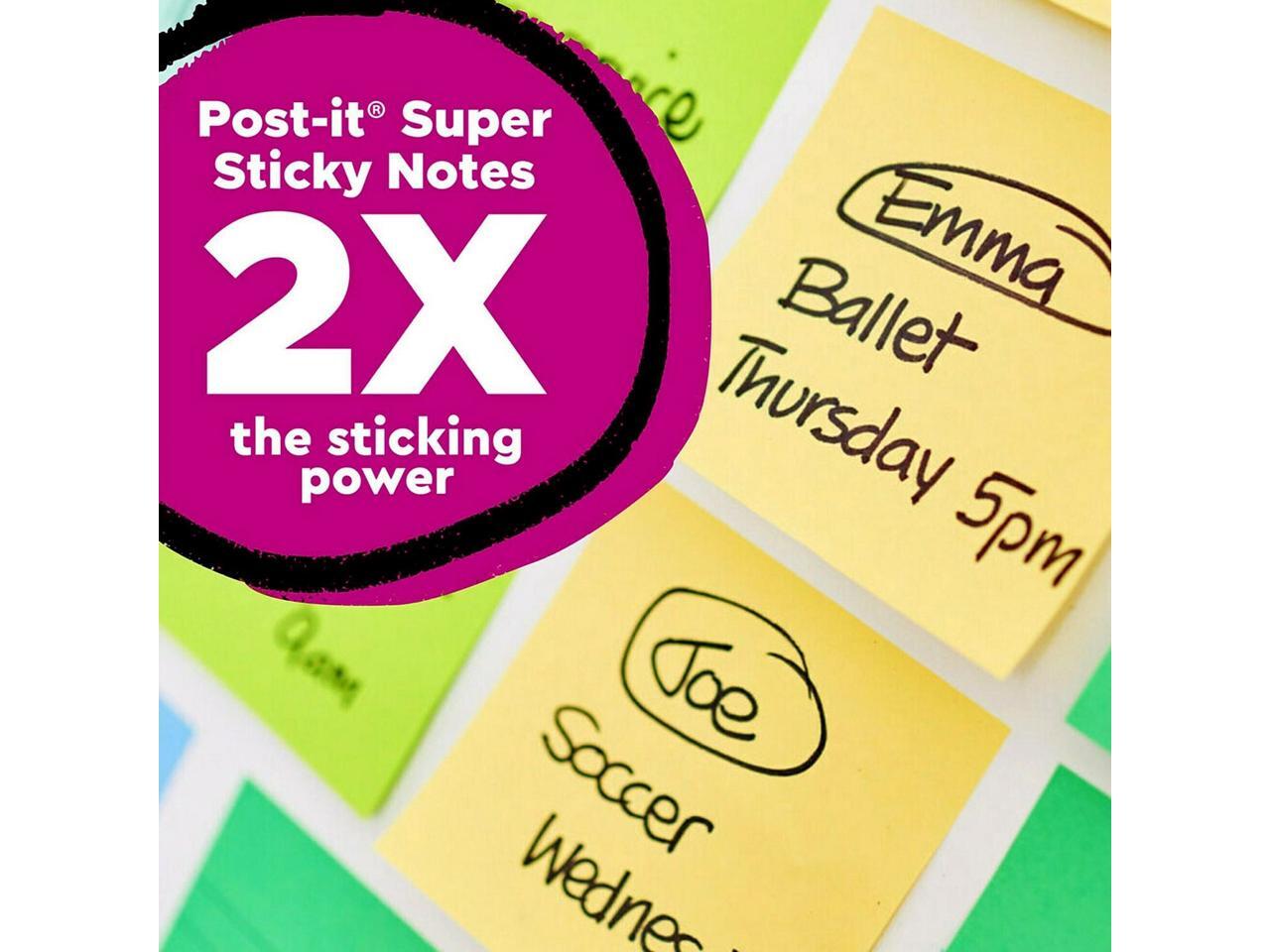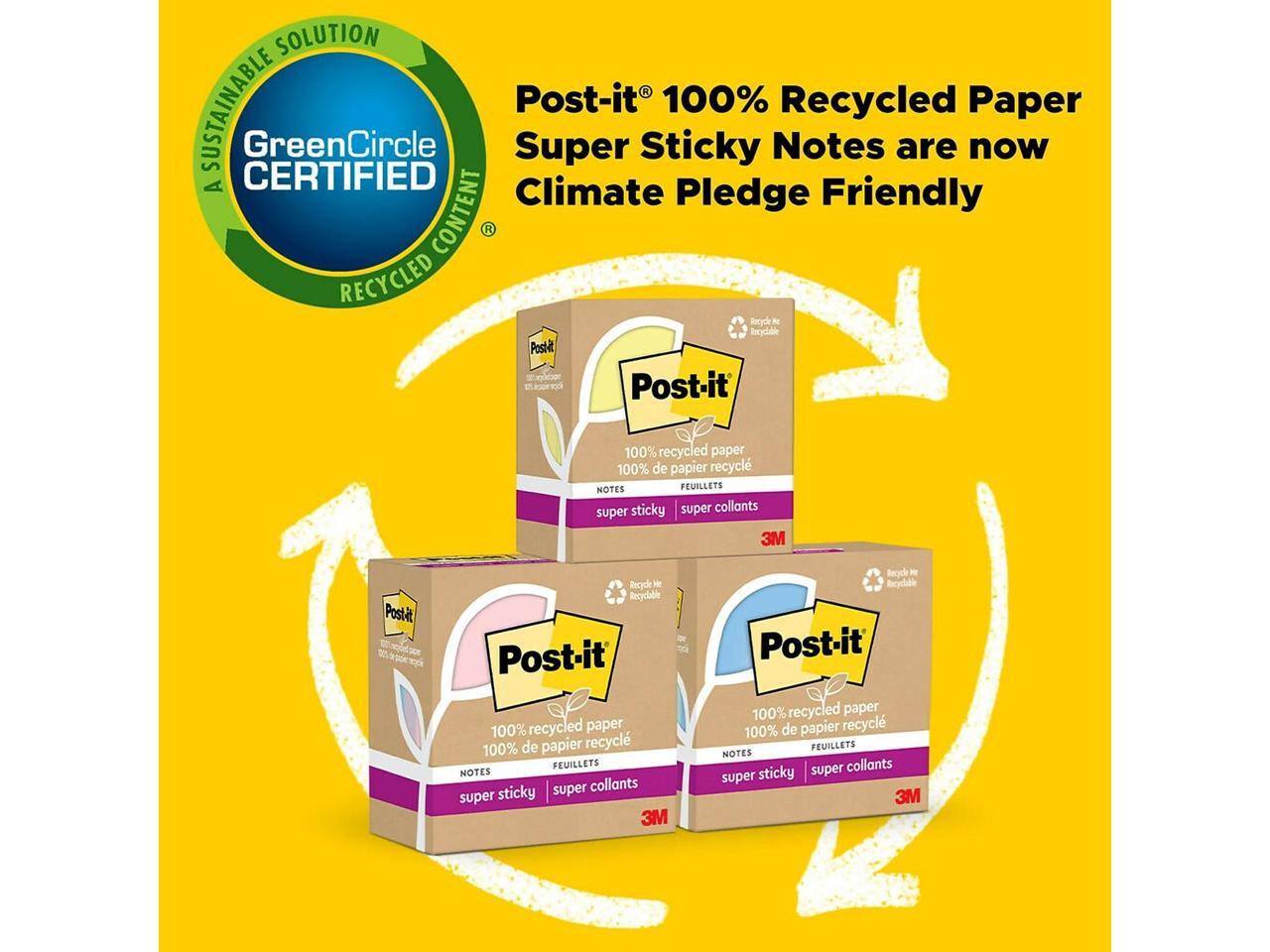 EXPERIENCE THE POWER OF 2X STICKINESS: Post-it Super Sticky Notes offer twice the sticking power of basic sticky notes using 100% recycled paper. EYE-CATCHING COLORS: Vibrant and colorful reminders are more likely to grab attention and be noticed. SUSTAINABILITY: Post-it Super Sticky Notes can be recycled.