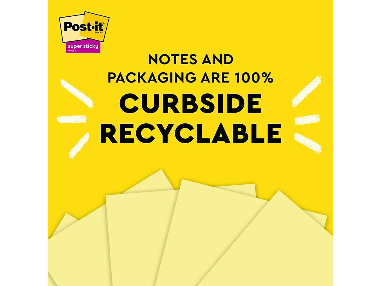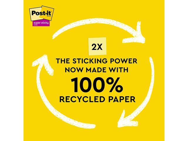 EXPERIENCE THE POWER OF 2X STICKINESS: Post-it Super Sticky Notes offer twice the sticking power of basic sticky notes using 100% recycled paper. EYE-CATCHING COLORS: Vibrant and colorful reminders are more likely to grab attention and be noticed. SUSTAINABILITY: Post-it Super Sticky Notes can be recycled.