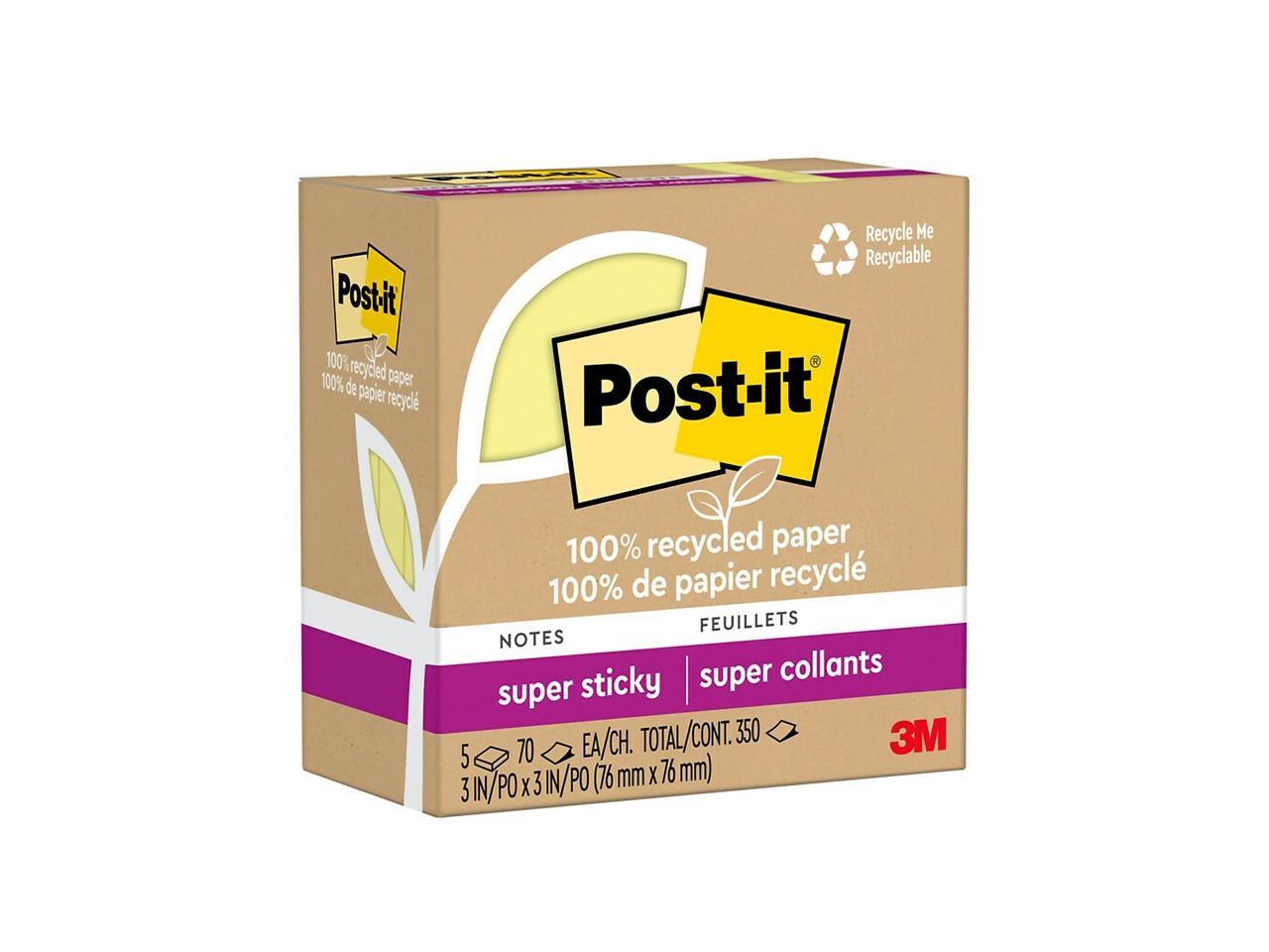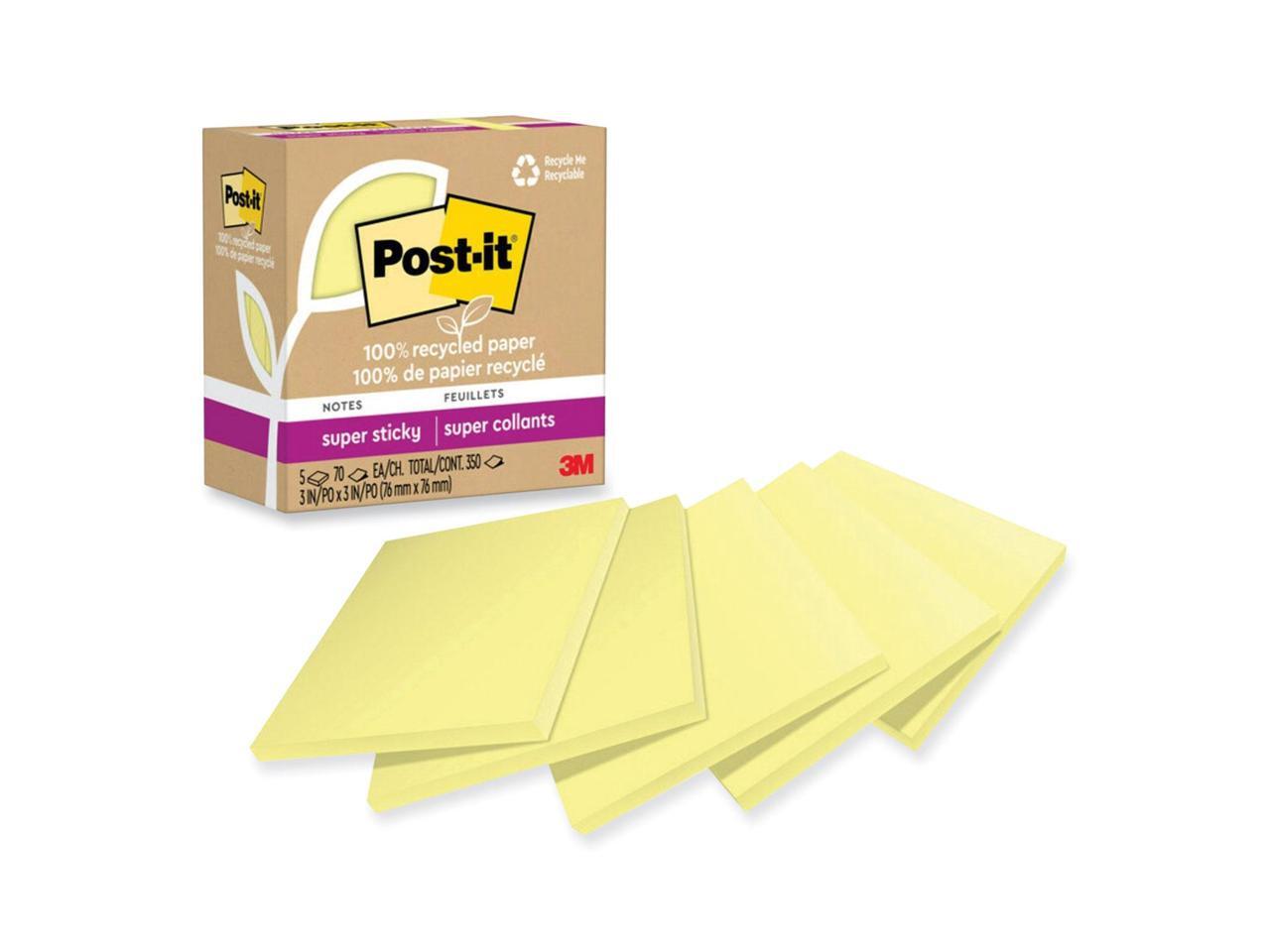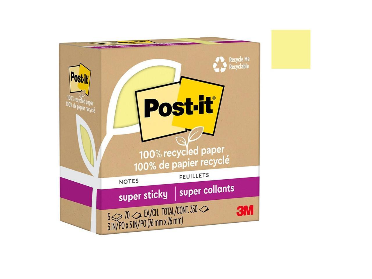 Post-it Recycled Super Sticky Notes 3" x 3" Canary Collection 70 Sheet/Pad 5 Pads/Pack (654R-5SSCY)