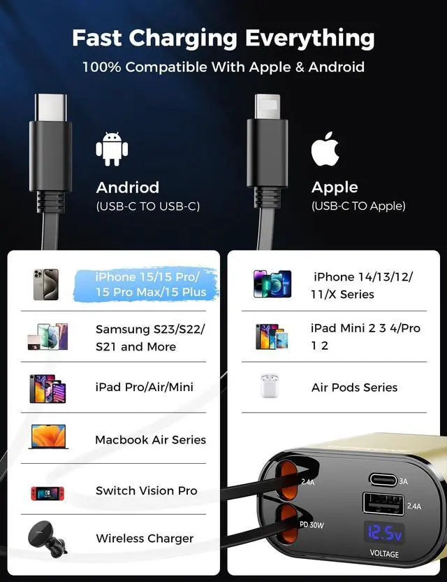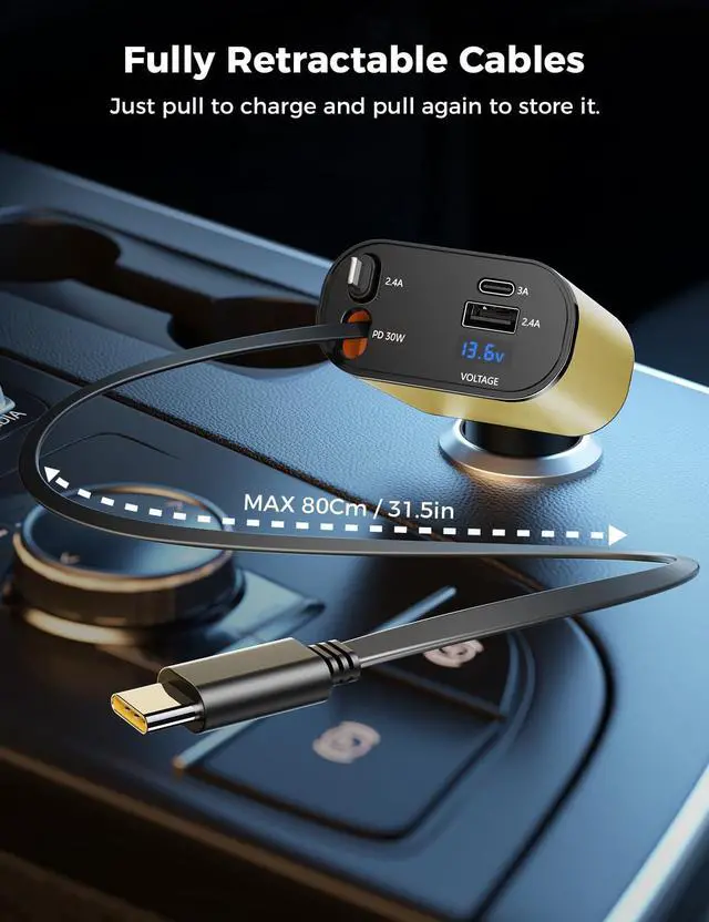 • Versatile 4-in-1 Functionality: With a type-C retractable cable, an IOS retractable cable, and additional USB-C and USB-A ports, this fast charge retractable car charger supports fast charging for up to 4 devices simultaneously. Say goodbye to the hassle of carrying multiple chargers for your different devices.This car charger is only for charging, and cannot be used for CarPlay