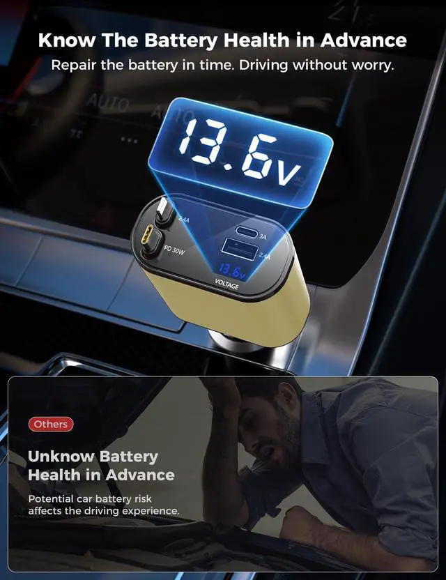 • Voltage Display for Battery Health Monitoring: Our Car Charger with cord is equipped with a voltage display feature, allowing you to monitor the health of your car battery at all times. Stay informed and ensure optimal performance for your vehicle.