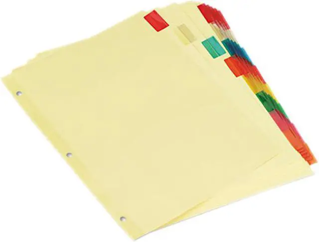 Three-hole punched, buff sheets with blank tab inserts. Single-sided clear Mylar reinforced binding edge. Tab Style: 8-Tab; Tab Color(s): Multicolor; Index Divider Size: 11 x 8 1/2; Form Quantity: 6.