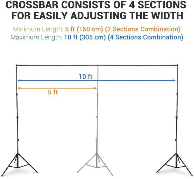 - Equipped with 4 pieces of 29" section crossbars featuring an adjustable width from 5 to 10 ft by combining 2 or 4 sections for backdrops of different widths; Also comes with 2 height-adjustable tripods which can be adjusted from 2 7/12 to 8 1/2 ft tall for backdrops of different heights.(We recommended that the maximum height be adjusted within 7ft for more stable)