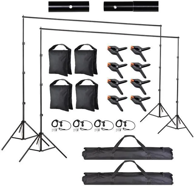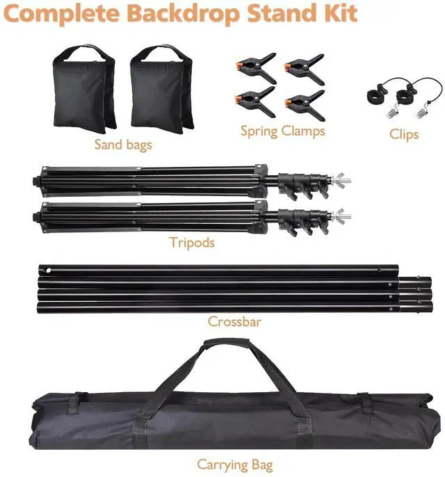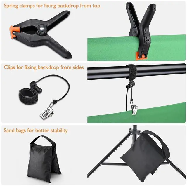 - Securing Clips & Sand Bags - Comes with 8pcs spring clips and 4pcs side clips for convenient and stable fixing of the backdrop from the top and sides, along with sand bags to help stabilize your stand