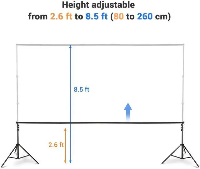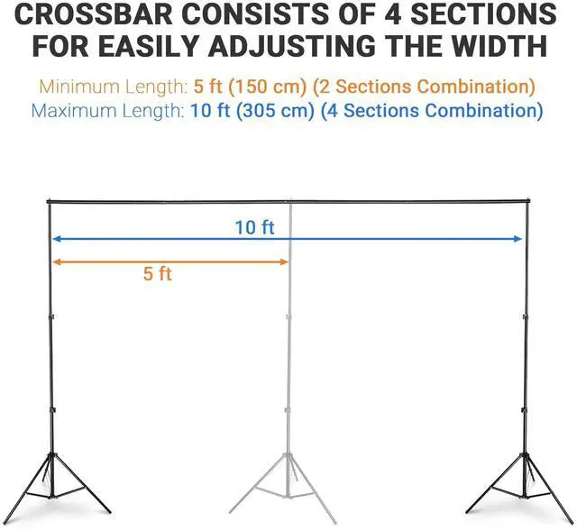 - Adjustable & Customizable - Each backdrop stand features adjustable crossbar width from 5 to 10 ft by combining 2 or 4 sections for backdrops of different widths, and the height-adjustable tripods can be adjusted from 2 7/12 to 8 1/2 ft tall for backdrops of different heights