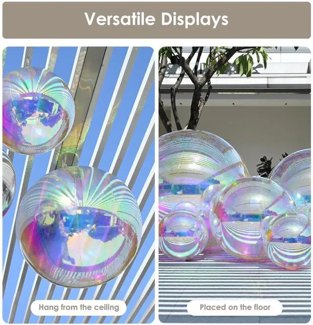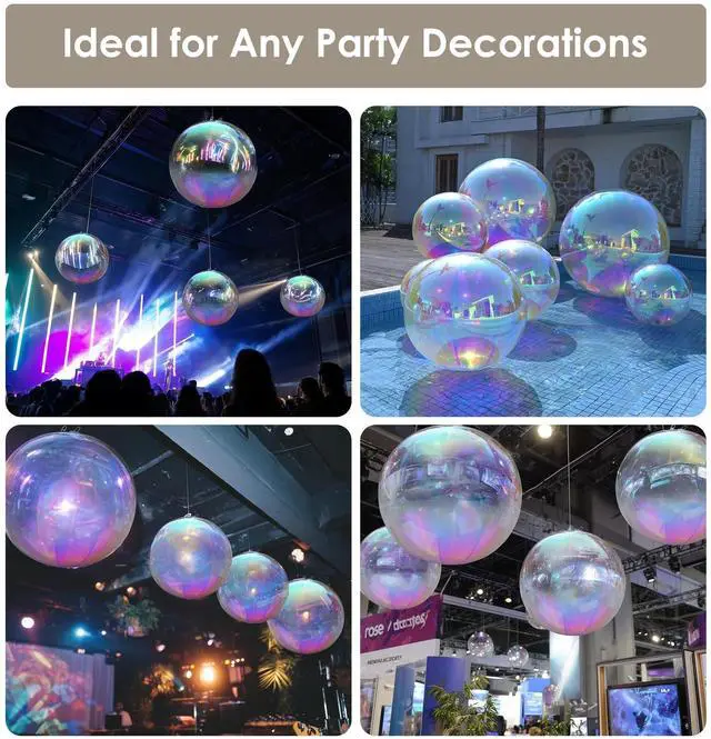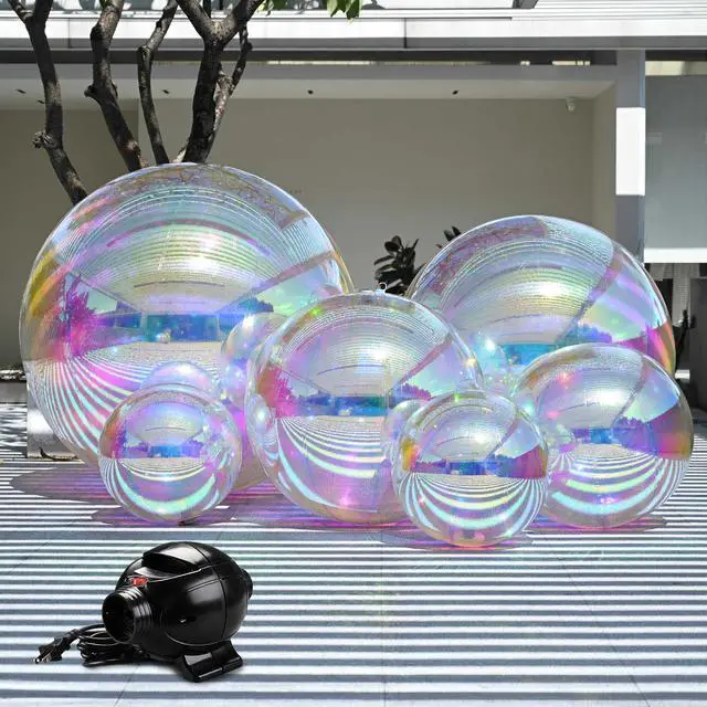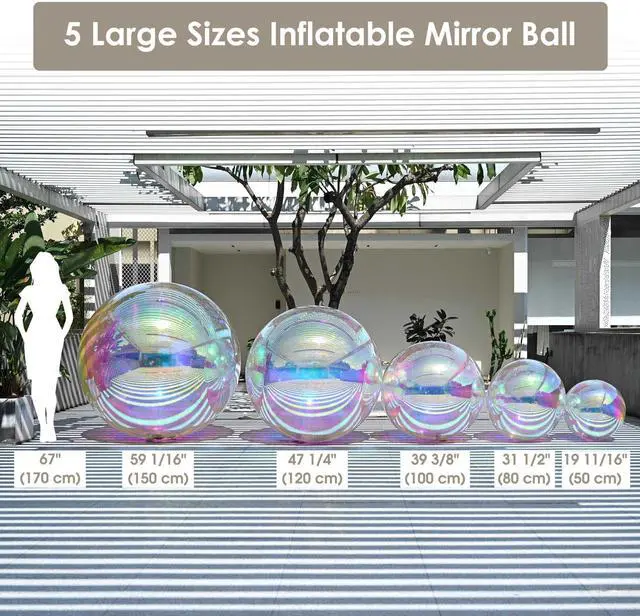 - Dazzling Party Spectacles - This 6-Piece Inflatable Mirror Ball Set with Electric Pump features a variety of sizes with 20inch*2, 32inch*1,39inch*1, 47inch*1, 59inch*1. Watch as these spectacular mirror balls capture and reflect light, casting a mesmerizing array of colors that will electrify your guests and create a truly unforgettable celebration