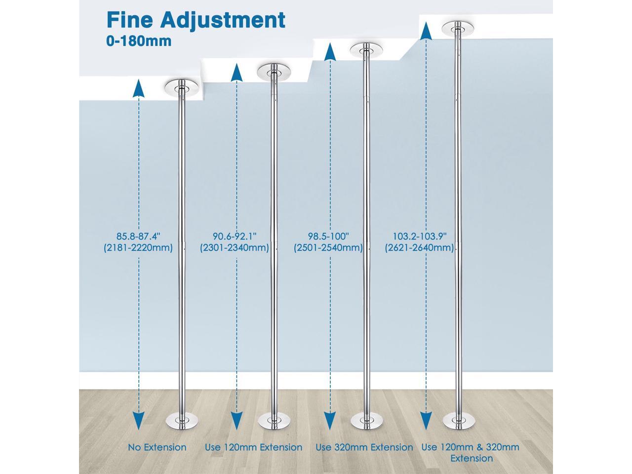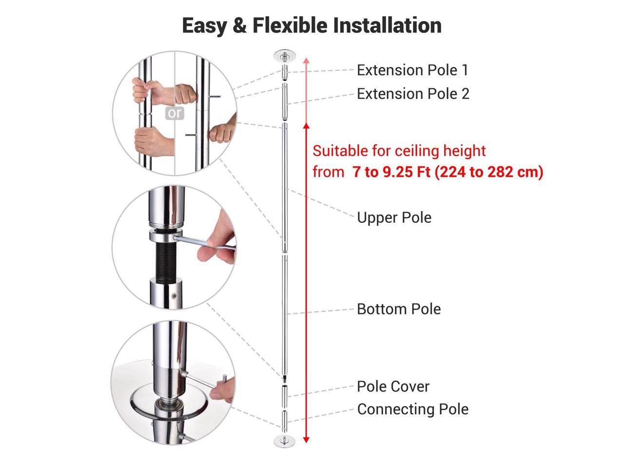 - Dancing pole features height adjustment with 2 extension poles to accommodate from 7 to 9.25 FT